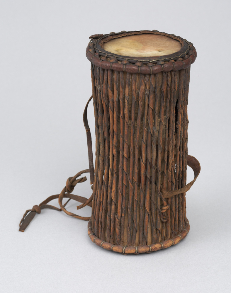 This is a double-sided African drum with an hourglass body that has been fashioned from a section of massive bamboo cane. The heads of skin are laced and lashed together with twisted leather thongs, and it has a rattling body inside. The drum comes in at 210mm height.