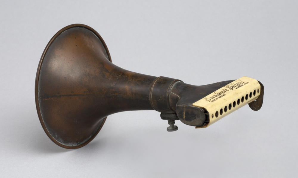 Produced in Germany between 1891 and 1906, this type of mouth organ is fitted with a trumpet bell and a marching lyre attachment, this was so that marching band musicians could read sheet music from it whilst marching.